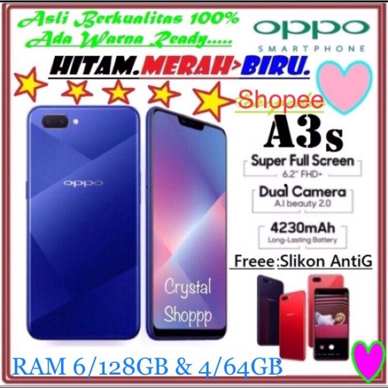 Harga OPPO A3s ORI RAM 6/128GB & 4/64GB BARU FULLSET SEGEL GARANSI 1TAHUN ASLI BERKUALITAS 100% saat ini masih murah hanya Rp. 875.000,00, kita tidak akan pernah tahu tentang Harga ini di masa depan, juga stok barang ini nanti atau besok hari, bisa saja harganya naik tinggi atau bisa juga stok sudah Habis.
